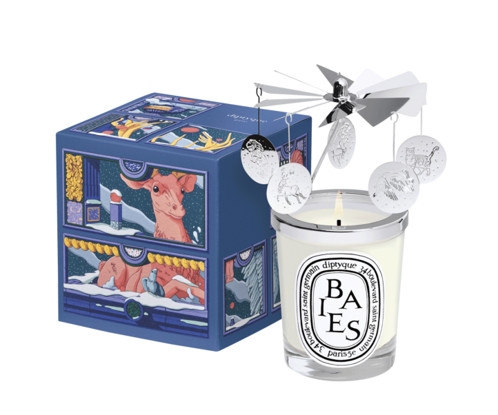 В этой свечке праздник выдает все — взгляните только на блестящую карусель, которая начинает раскручиваться, весело мерцая, стоит поджечь фитиль. Присмотритесь внимательно: карусель катает волшебных зверей — кошка, олень, лев, слон и лебедь нарисованы на каждой сверкающей кисточке.