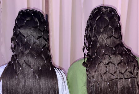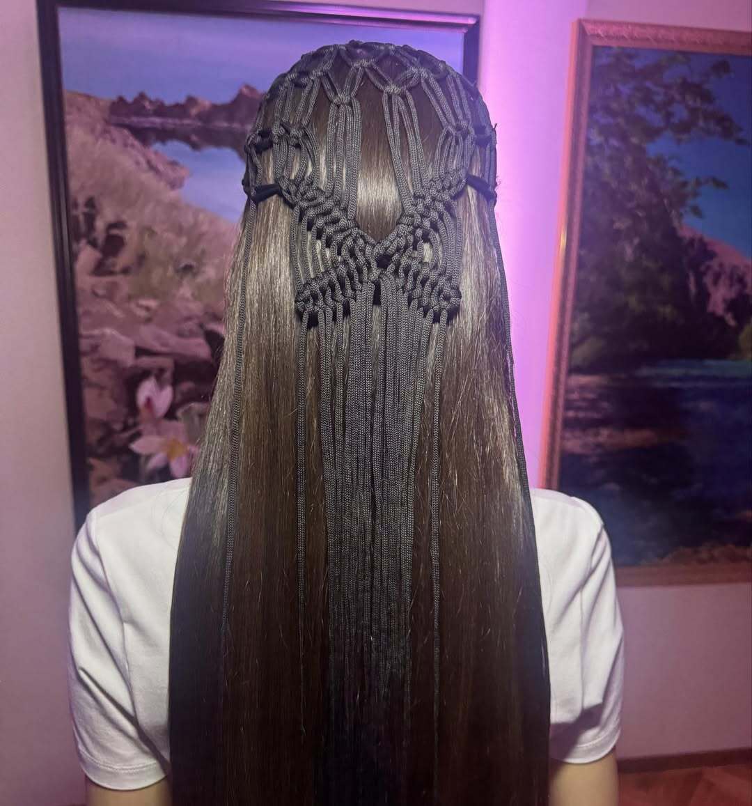 Продолжайте переплетать хвостики вниз, формируя сеточку из соединенных прядей. Следите, чтобы резинки располагались на одинаковой высоте и создавали ровный «шахматный» рисунок.