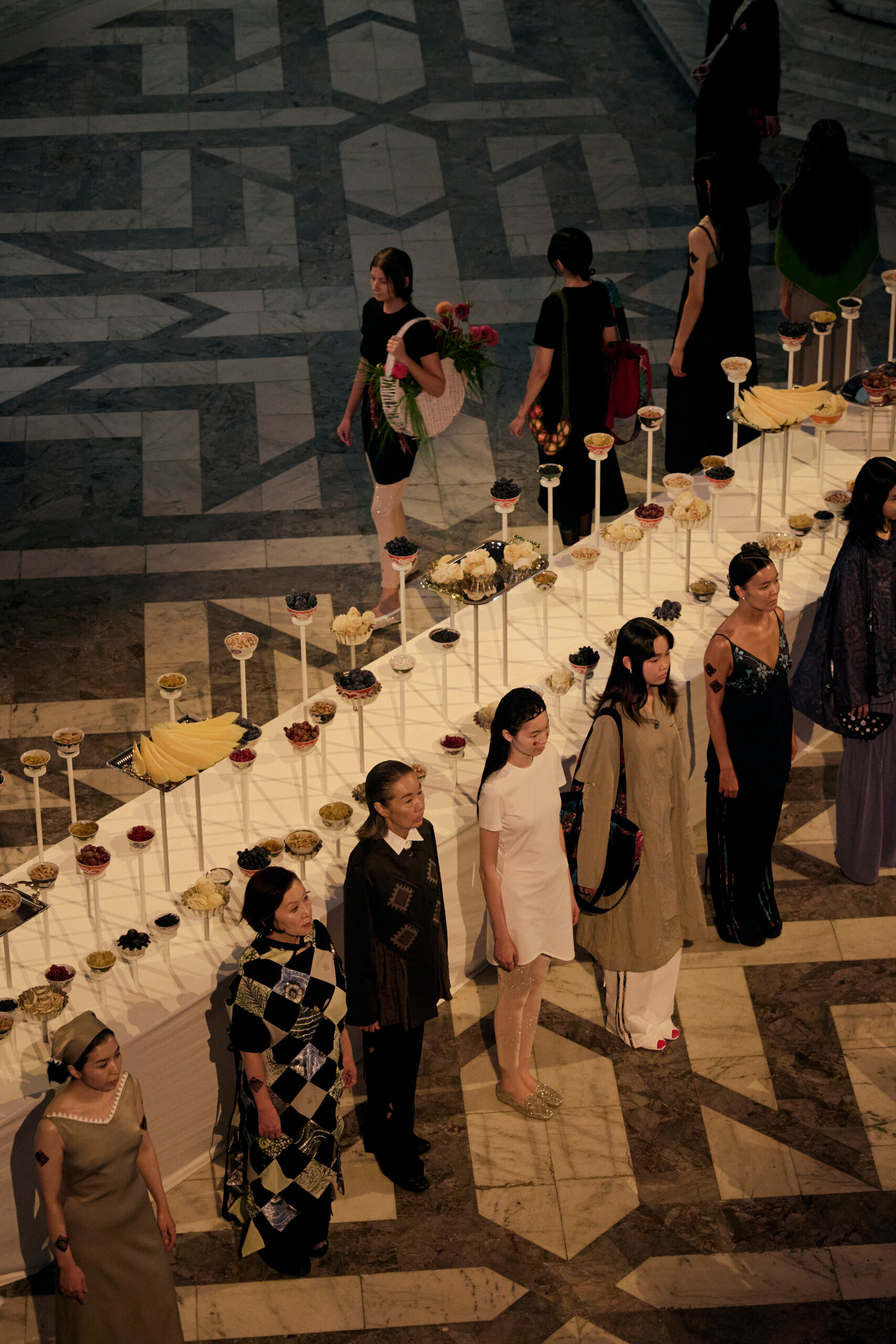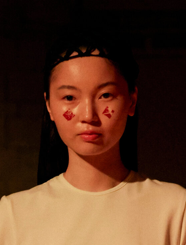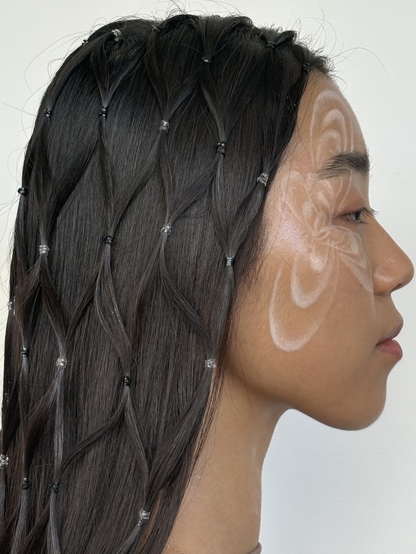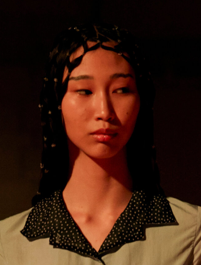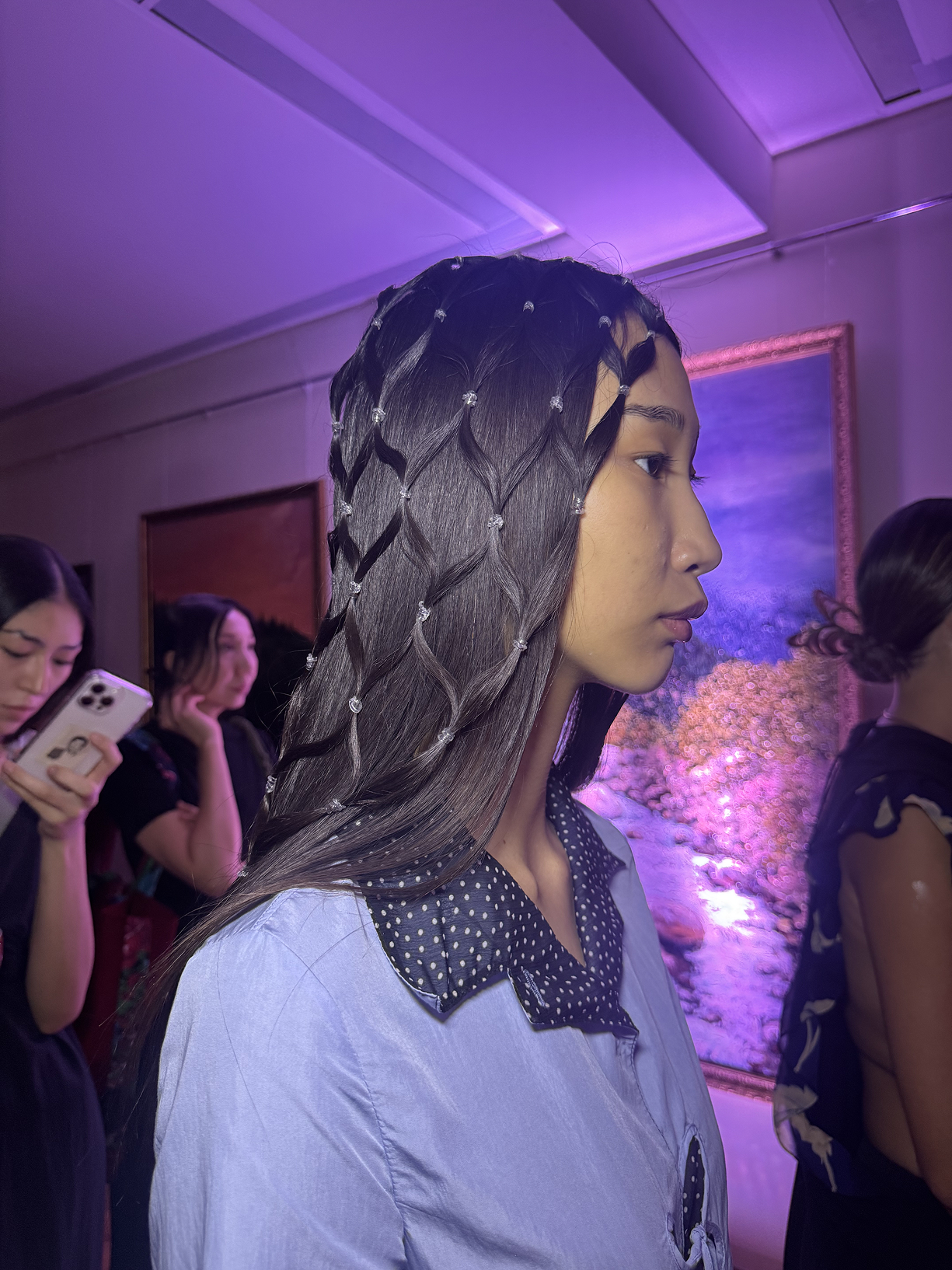 Но, пожалуй, самой эффектной укладкой на шоу стала сеточка из волос, которая напоминает детскую прическу «паутинка» — собранные крошечными резинками по всей голове прядки, формирующие затейливый орнамент. «У Жени были конкретные референсы, где волосы сплетаются резинками, как в детстве, изначально мы отталкивались от них. Затем мы увидели локацию (показ проходил в Центральном государственном музее Республики Казахстан. — Прим. The Blueprint) и коллекцию, и все гармонично сплелось воедино», — рассказывает Дмитрий. «В коллекции есть плетеные сетки для овощей, которые мы разработали для J.Kim Objects, — добавляет Женя Ким. — Дима их классно переосмыслил и сделал более художественно выразительными».