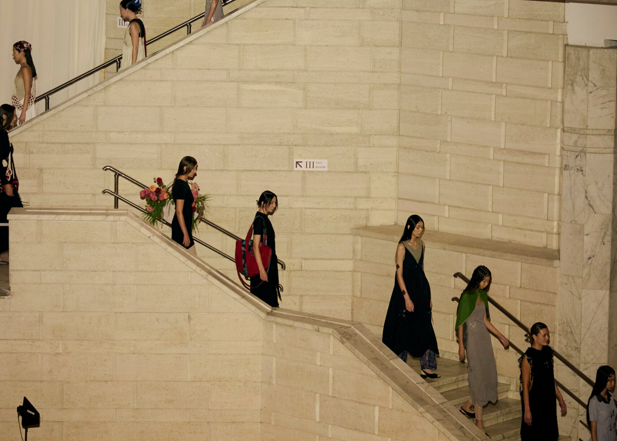 Так или иначе сетка — одна из главных метафор показа J.Kim. По словам Жени Ким, коллекция посвящена не только узбекскому лоскутному шитью, символизирующему силу и объединение, но и семейным традициям. «Эта прическа — абстракция, — добавляет Дмитрий. — Простая, но эффектная».