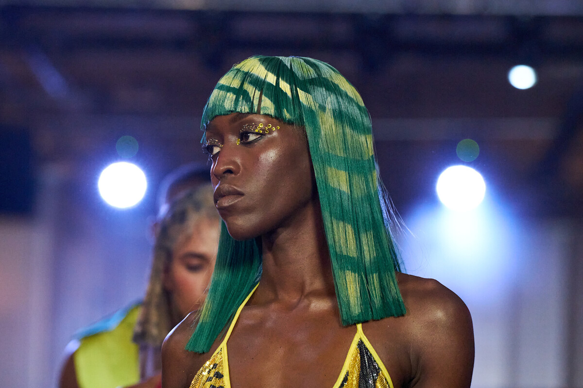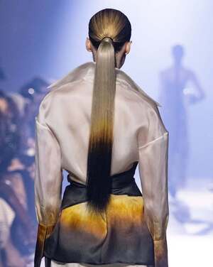 Алексей Горбатюк, стилист и основатель салона «Алгоритм Beauty Club», согласен: halo hair — это переосмысленная техника блочного окрашивания из нулевых, когда волосы делили на зоны и осветляли выборочные секции. «Раньше блик всегда смещался к пробору и выглядел мягко и деликатно, — говорит Алексей. — Сегодня же halo hair приобрело вид настоящего нимба — яркого и графичного». И эти новые виды блочного окрашивания будоражат не только соцсети. На недавнем показе Grace Ling весна—лето 2026 модели выходили на подиум с длинными хвостами, цвет на которых перетекал от темного к светлому, повторяя градиент на одежде. За прически, кстати, отвечал тот же Эвани Фраусто. А на показе Theophilio волосы моделей были разрисованы яркими графичными узорами через трафарет от корней до кончиков. Так что скромный нимб — это еще по-божески.