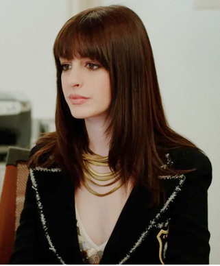На протяжении фильма Энди Сакс полностью меняет свой образ — наряд и макияж, — но практически не меняет прическу: она носит длинные волосы с мягкой, чуть неровной челкой. Но если сначала разделяет ее на две части, как шторку, то позже укладывает так, чтобы челка прикрывала лоб чуть ниже бровей — в стиле 60-х. Именно таким образом сейчас носят челки Дакота Джонсон, Марго Робби, Памела Андерсон, Дейзи Эдгар-Джонс и другие любимицы модной индустрии.