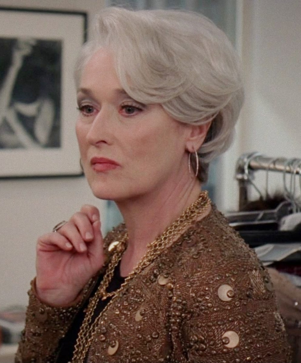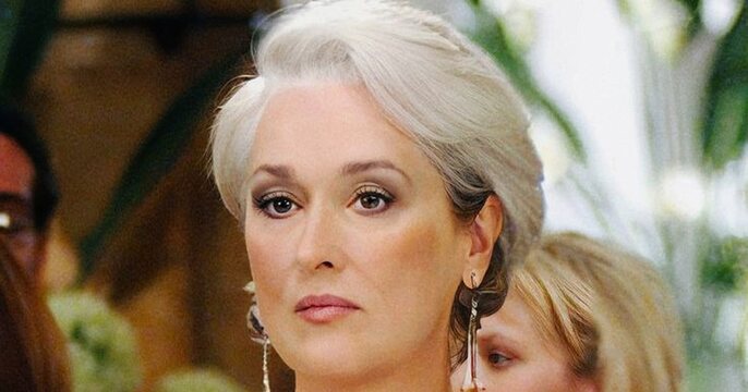 Фирменная прическа Миранды Пристли — короткое белое каре, уложенное набок, — в свое время взорвала модную прессу: отказ самой модной женщины в мире, пусть и вымышленной, закрашивать седину вдохновил множество женщин сделать такой же выбор. Седые и белые волосы (натуральные или аккуратно тонированные с помощью техник вроде French blending) не первый год становятся трендом на показах (включая Tom Ford, осень-зима 2026/2027), в соцсетях, где сильны сообщества вроде Silver Sisters, и на красных дорожках, где мелькают серебристые гривы Энди Макдауэлл, Гленн Клоуз и самой Миранды Пристли — то есть Мерил Стрип.