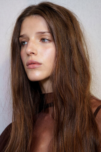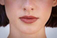 Мару Ловэ советует смотреть в сторону underground-палитры — пыльные, «грязноватые» оттенки, которые при этом выглядят натурально: бежево-коричневые, шоколадные, телесные с серым подтоном. А для усиления эффекта «покусанных губ» можно добавить в центр каплю алого или кроваво-бордового тинта, слегка растушевав границы.