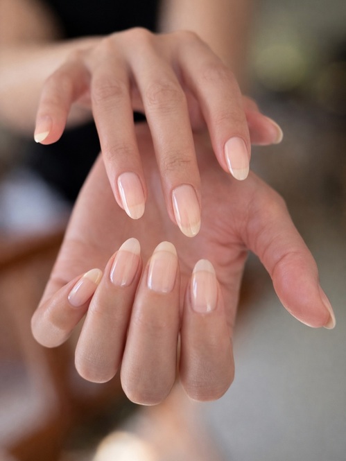 Это самая деликатная версия классического французского маникюра, в которой сохраняется его главный принцип — более светлый край ногтя, — но исчезает главное, за что его обычно узнают: контрастная белая линия. По сути — это маникюр без маникюра, потому что ногти выглядят не накрашенными, а просто ухоженными.