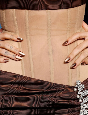 Еще один вариант для любителей темного покрытия на ногтях — насыщенные коричневые оттенки: от сливочно-кофейного до глубокого темно-шоколадного. Особенно популярны сейчас два направления. Цвет свежесваренного эспрессо — плотное и гладкое покрытие. Либо кофейный металлик, как у Хейли Бибер на ковровой дорожке Academy Museum Gala 2025.