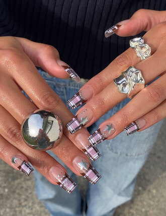 Обвесом на сумке уже никого не удивишь, а как насчет обвеса на ногтях? Лабубу вешать не предлагаем, есть куда более актуальный вариант — всевозможные имитации пирсинга. Пересматриваем показы SRVC и Sinead Gorey осень—зима 2025/2026: на первом ногти моделей были проколоты сережкой-штангой, на втором с них свисали цепи и брелоки. «Я как-то использовала обычные сережки-гвоздики с камнями с “Вайлдберриз”, выглядело супер, — подсказывает идею нейл-стилист Кристина Ясюкевич. — Главное — отойти от минимализма и чуть утрировать. Если пирсинг, то такой, чтобы его было видно и даже слышно».