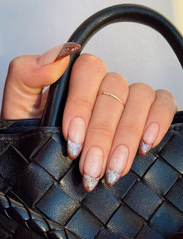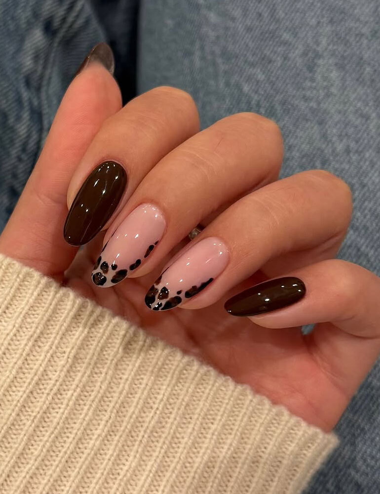 Классно работает и сочетание кофейного оттенка с нюдом или прозрачной базой: например, когда свободный край рисуют тонким шоколадным френчем, а у основания добавляют маленькие капли или графичные детали. Это делает маникюр мягким, женственным и чуть более сложным визуально. «Кофейный» маникюр подойдет любой форме и длине ногтей: короткие ногти сделают его более повседневным и «чистым», длинные — глубоким и эффектным.