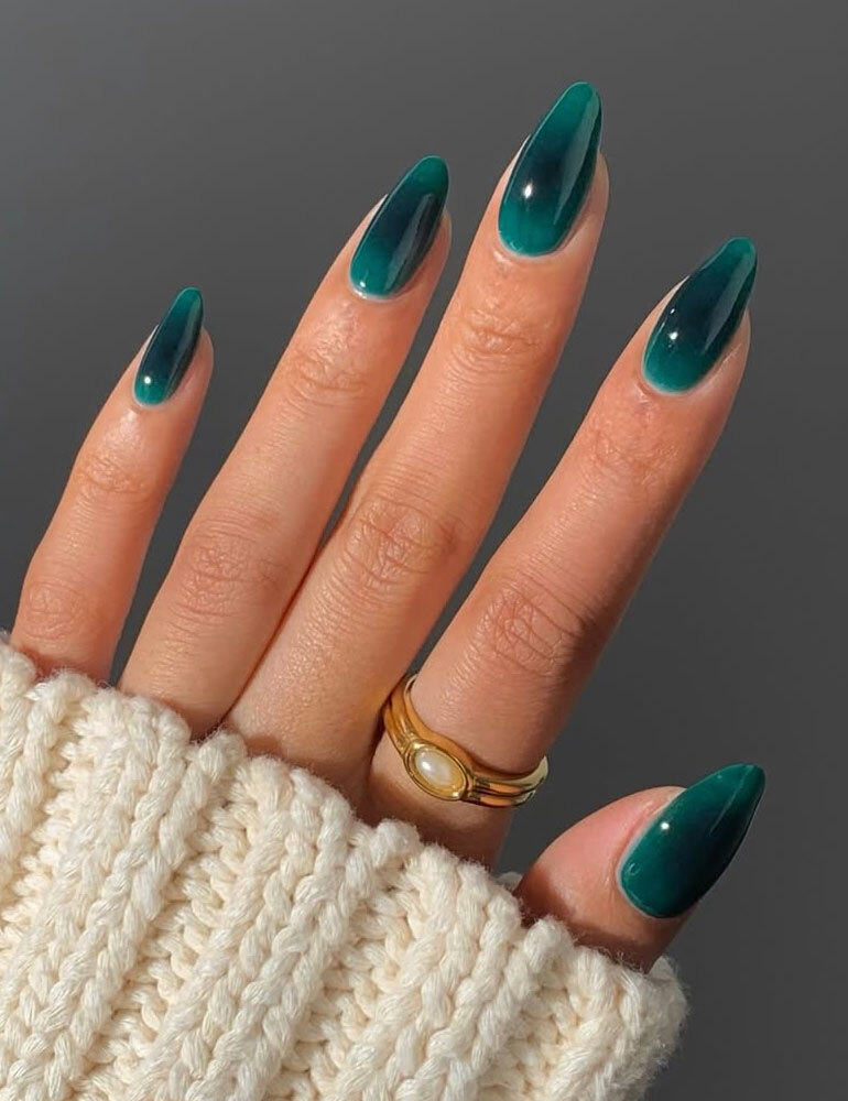 Темно-зеленый лак зимой — не столько тренд, сколько стабильность: глубокий хвойный, насыщенный изумрудный, бутылочно-зеленый — каждый год эти оттенки возвращаются и всегда выглядят благородно. Но в этом сезоне темно-зеленый особенно хорош благодаря сочетанию разных фактур. Во-первых, можно использовать тот же «кошачий глаз». «Его блики создадут эффект движения и добавят глубины цвету, — говорит Яна Topcoat, маркетинг-директора бренда Ta2. — Кажется, обычный статичный лак на фоне “кошачьего” уже выглядит чем-то из прошлого».