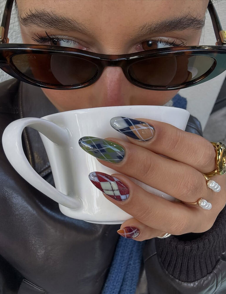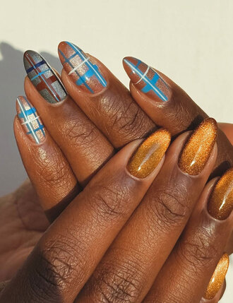 Клетке — одному из главных модных трендов сезона осень-зима 2025/2026 — место не только в гардеробе, но и на ногтях. Вдохновение предлагаем искать не только на подиуме (хотя знаменитая клетка Burberry — беспроигрышный вариант для нейл-арта), но и у вас дома — можно буквально скопировать принт с пледа на диване и получить актуальный маникюр. Сочетания цветов тоже можно подсмотреть в интерьере либо выбрать что-то из наиболее модного: например, оранжево-карамельный фон с неоновыми голубыми и розовыми линиями или серо-голубая база и клетка оттенка темного шоколада. А если узоры прорисовать лаком «кошачий глаз», то маникюр будет казаться более тактильным и объемным.