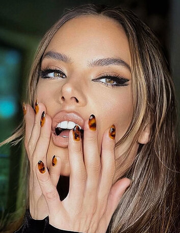 Черепаховый принт на ногтях появился как альтернатива шоколадным и кофейным оттенкам, но быстро перерос в самостоятельный большой тренд, который уже полюбился Дуа Липе и Алессандре Амбросио. «Черепаховый» эффект строится на многослойности: полупрозрачная теплая база (часто оранжевая или медовая) сверху дополняется хаотичными пятнами коричневого, шоколадного и черного лака. И чем более «неидеально» распределены эти пятна, тем натуральнее выглядит рисунок.