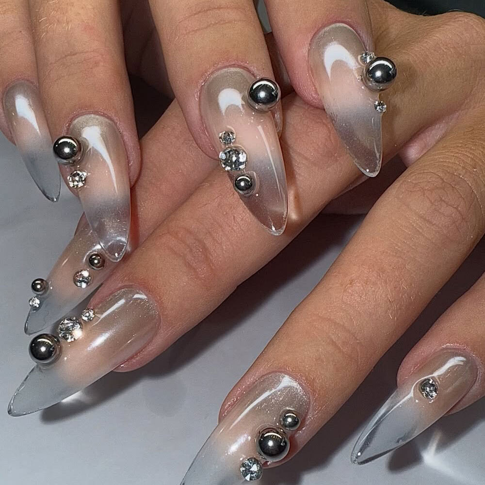 И не забываем: проколы лучше делать на искусственных или укрепленных гелем длинных ногтях, чтобы ничего не ломалось и долго держалось. Можно обойтись и без отверстий вовсе — приклеить на ногти серебристые бусины, которые будут напоминать шары от пирсинга.