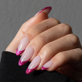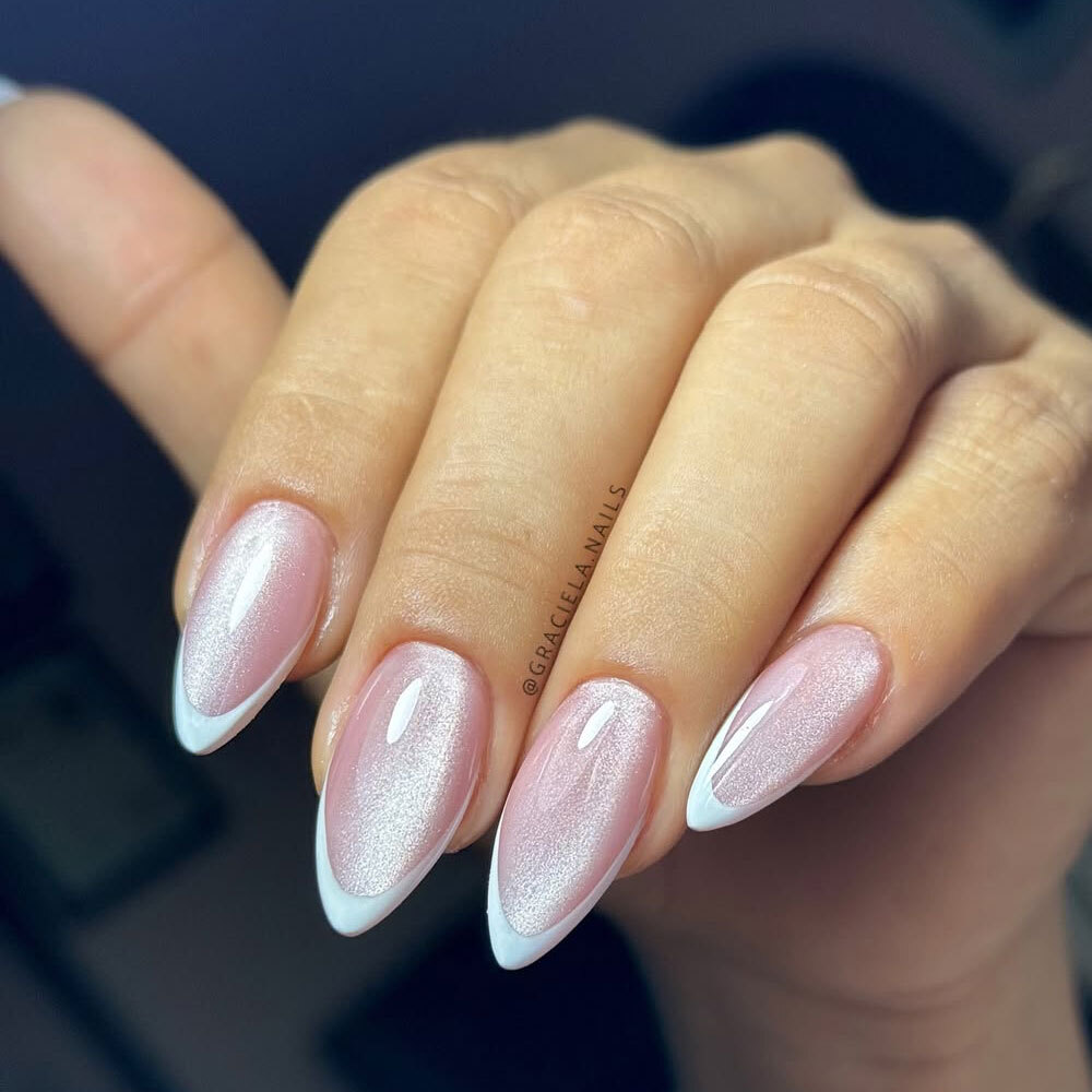 Самое модное сочетание прямо сейчас — «кошачий глаз» вместе с французским маникюром, в тиктоке по запросу velvet french tip nails уже больше 50 миллионов постов. Мастера делают бархатный френч двумя способами: либо создают перелив по всей пластине, а затем выделяют край ногтя контрастным лаком, либо, наоборот, оставляют базу нюдовой, а «кошачий глаз» наносят только по линии «улыбки» (такой маникюр нейл-мастер Зола Ганзориг недавно сделала Кайли Дженнер). «Бархатный френч особенно выигрышно смотрится на средней длине и овальной или миндальной форме», — подсказывает Кристина Ясюкевич.