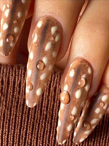 Принт с пятнышками, напоминающими шкурку Бэмби, был ярким микротрендом этой зимы. Но если вы так и не успели обзавестись «оленьей» сумкой или пальто из осенне-зимней коллекции 032C, весна — отличный повод примерить тренд хотя бы на ногтях. Тем более что смотрится такой маникюр одновременно уютно и аккуратно: теплые карамельные, кофейные и молочные оттенки со всем сочетаются и выглядят неброско. В основе — мягкая коричневая база и хаотично расставленные светлые пятнышки, иногда дополненные каплями прозрачного геля для объема.