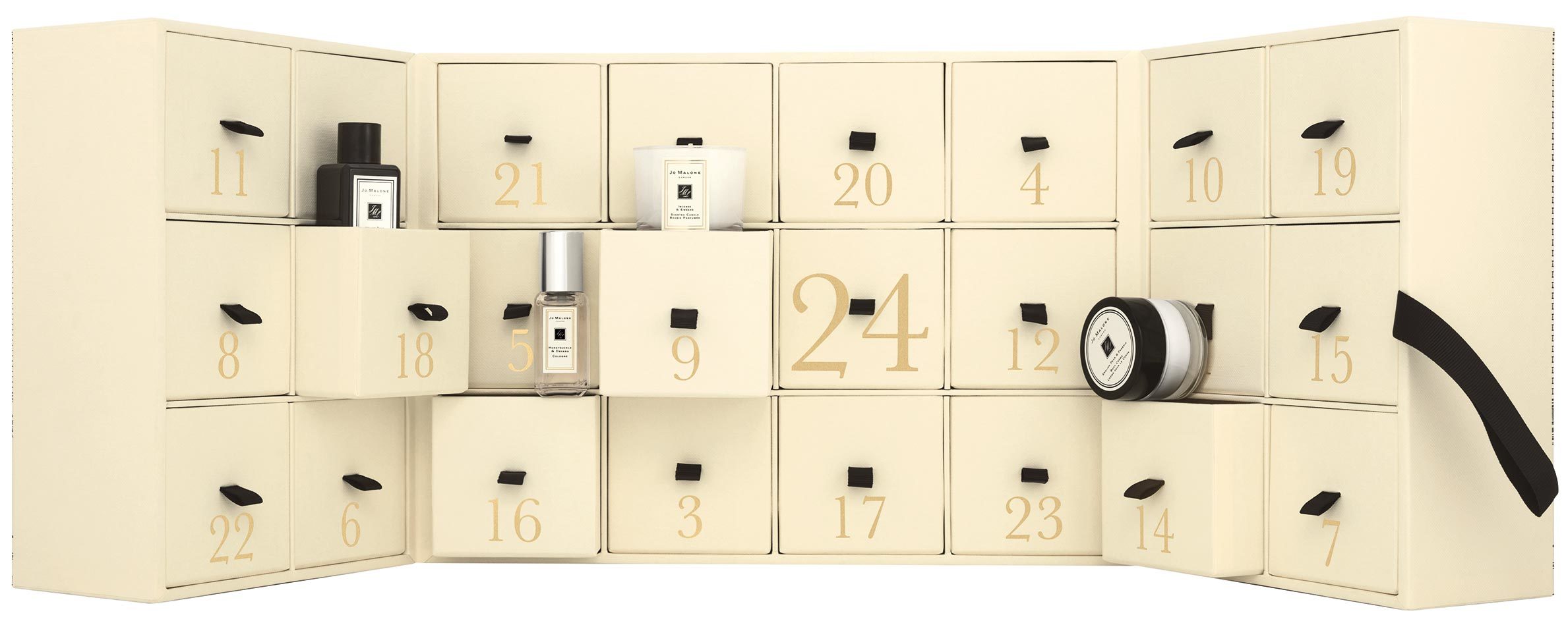 Если ищете подарок для парфманьяка или сами им являетесь, обязательно загляните в корнер Jo Malone. Марка выпустила миниатюрный комод на 24 ящика, в каждом из которых спрятаны бестселлеры бренда: одеколоны, свечки и кремы.