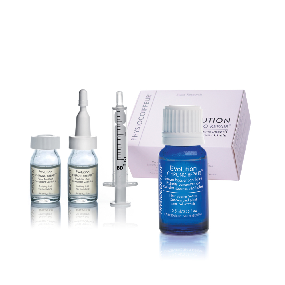 Содержит экстракт стволовых клеток тех самых яблок Uttwiler Spätlauber, богатых фитонутриентами, белками и танином. Предотвращает окисление натуральных пигментов волос и задерживает старение волосяных фолликулов. В наборе — семь восстанавливающих флюидов и одна сыворотка-усилитель. Предполагается, что два компонента нужно самостоятельно смешивать с помощью шприца, который прилагается к набору.