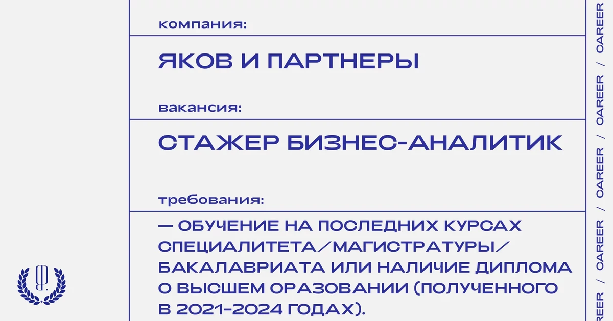 Резюме и сопроводительное письмо (оба — на английском языке) с темой письма «Business Analyst Intern от The Blueprint» отправляйте на почту: talentacquisition@yakov.partners. Дедлайн — 13 октября