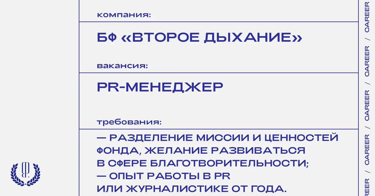 Благотворительный фонд «Второе дыхание» ищет PR-менеджера.