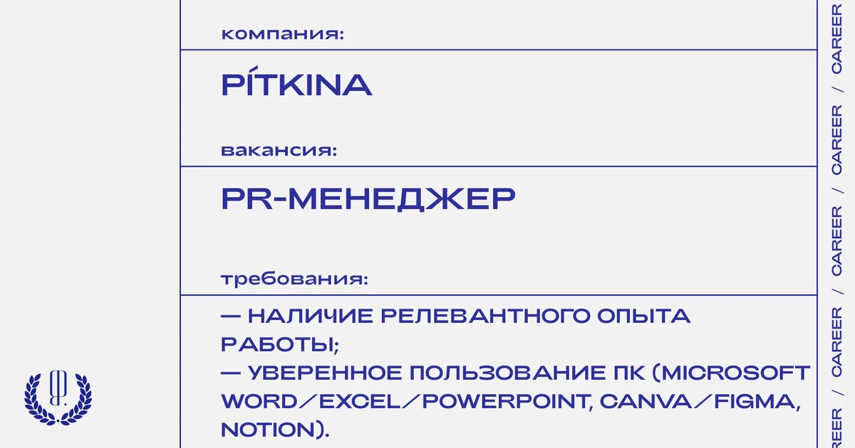 Резюме с темой письма «PR-менеджер Pítkina от The Blueprint» отправляйте на почту: hr@pitkina.ru