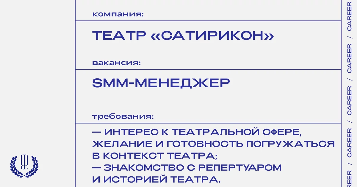 Резюме с темой письма «от The Blueprint» отправляйте на почту: pr@satirikon.ru