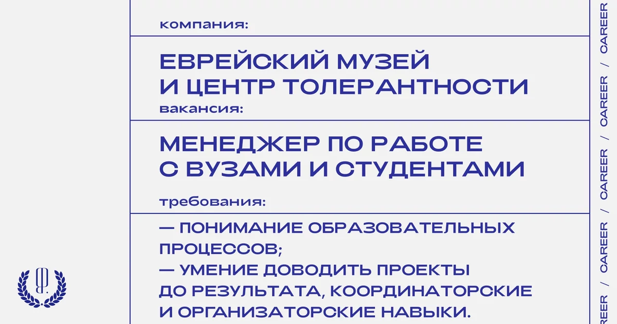 Резюме и выполненное тестовое задание с темой письма «Менеджер по работе с вузами и студентами от The Blueprint» отправляйте на почту: rc@jewish-museum.ru с темой письма. Дедлайн — 3 декабря.