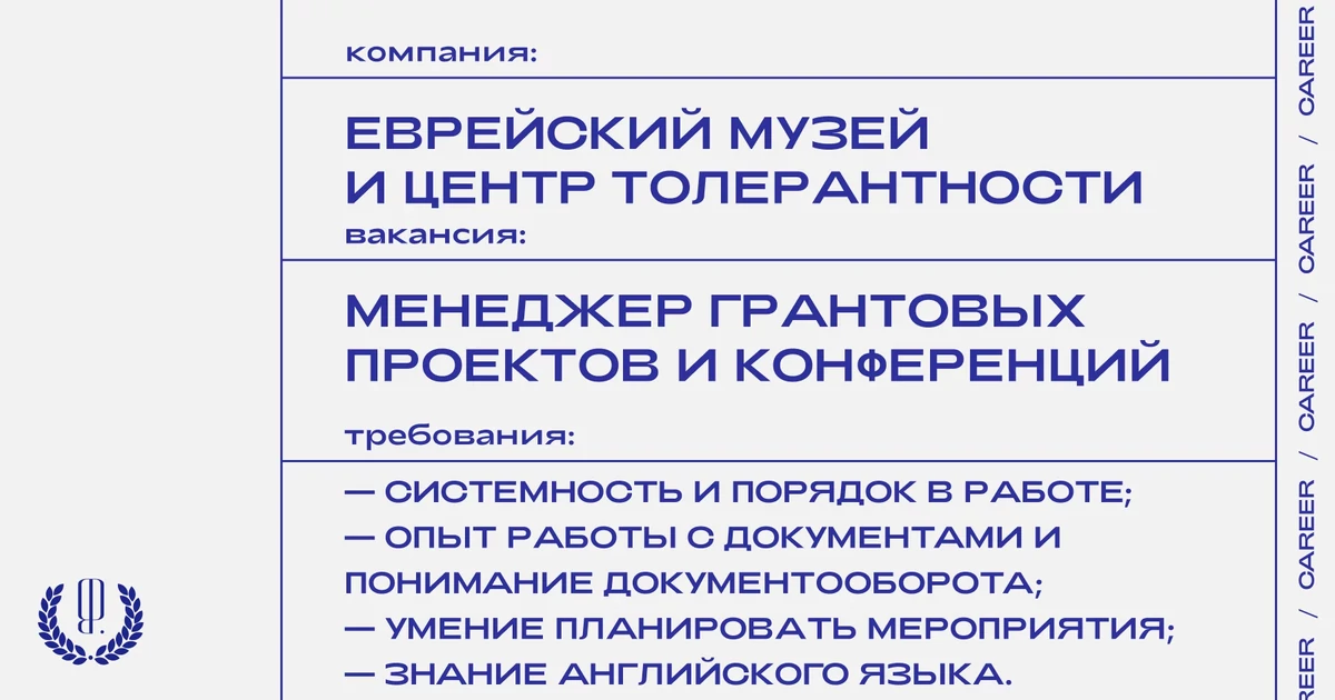 Резюме и выполненное тестовое задание с темой письма «Менеджер грантовых проектов и конференций от The Blueprint» отправляйте на почту: rc@jewish-museum.ru с темой письма. Дедлайн — 3 декабря.