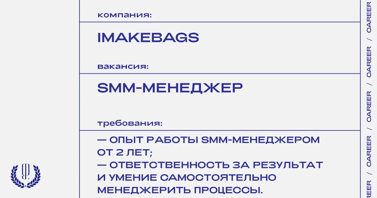 Резюме, портфолио и небольшое сопроводительное письмо со ссылками на ваши соцсети с темой письма «SMM-менеджер от The Blueprint» отправляйте на почту: info@imakebags.com