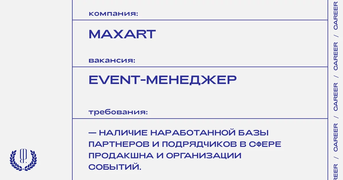 Резюме, портфолио с реализованными проектами и сопроводительное письмо с темой «EVENT-МЕНЕДЖЕР от The Blueprint» отправляйте на почту: info@maxart-foundation.com