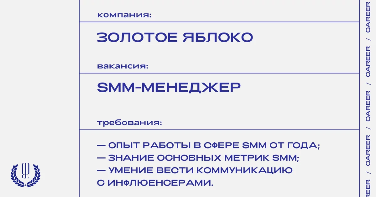 Резюме с пометкой «SMM-менеджер от Blueprint» отправляйте на почту: maltseva_k@goldapple.ru