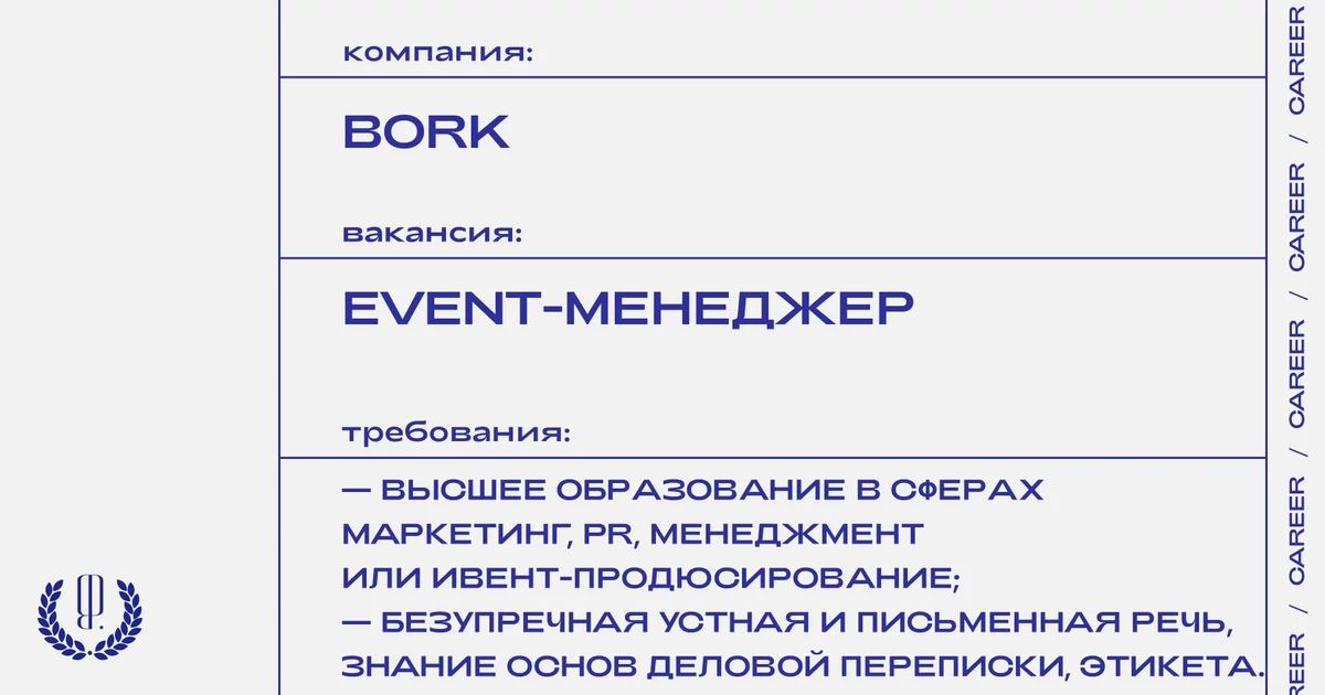 Резюме с темой письма «от The Blueprint» отправляйте на почту: valeriya.chernova@bork.com