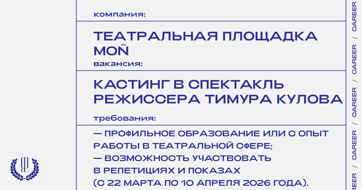 — возможность участвовать в репетициях и показах на площадке MOÑ (с 22 марта по 10 апреля 2026 года);