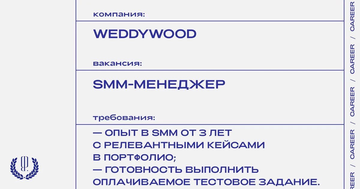 Резюме, портфолио, рассказ о себе и о том, почему вы хотите работать в Weddywood с темой письма «SMM от The Blueprint» отправляйте на почту: hello@weddywood.ru