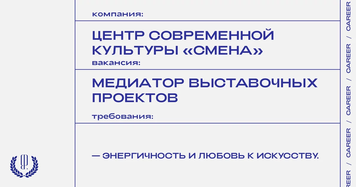 Резюме и короткий рассказ о себе с темой письма «Медиатор от The Blueprint» отправляйте на почту: smenagallery@gmail.com