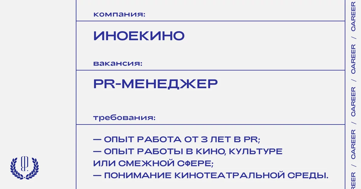 Резюме, краткое описание реализованных PR-проектов, примеры публикаций или кейсов и ссылки на соцсети (по желанию) с темой письма «от The Blueprint» отправляйте на почту: bazhin@inoekino.com