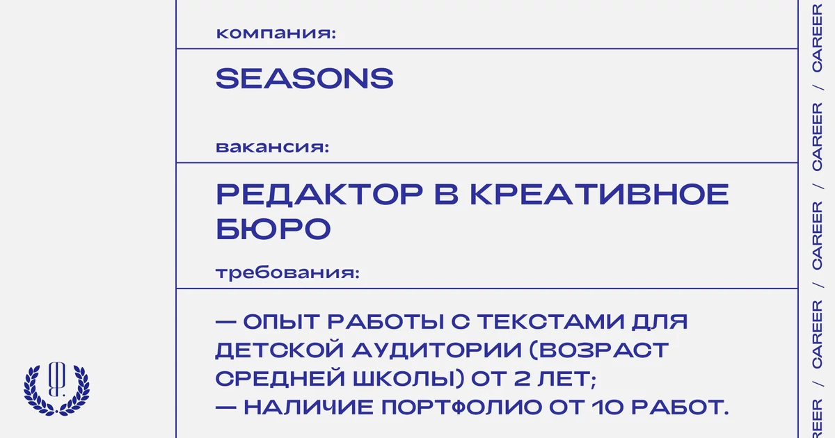 Резюме и портфолио с темой письма «Редактор в Креативное бюро Seasons от The Blueprint» отправляйте на почту: a.vaschenko@seasons-project.ru. Вакансия закрыта.