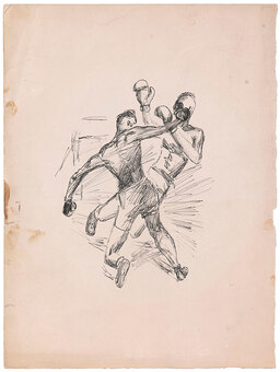 Кажется, что телесность у Дейнеки неизменно оптимистична и победительна, но это не совсем так — например, «Боксер» (1925) показывает лежащее тело, очевидно, после нокаута. Хотя даже в этой фигуре сохраняется динамика — как будто спортсмен упал только что, и карандаш художника сработал как фотоаппарат. Рядом, явно для сравнения — «Лежащая натурщица» того же года, она и вовсе кажется запечатленной в падении. Тело у Дейнеки, даже статичное, всегда куда-то устремлено — к победе, трудовому рекорду, в будущее. На этом пути случаются падения, но взлетов все-таки несравнимо больше.