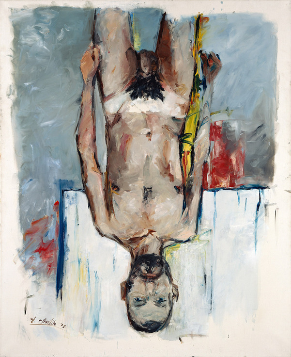 С конца 1960-х Георг Базелиц начинает переворачивать свои работы — в диапазоне от камерных портретов до христианского «Возложение тернового венца». Буквализированная метафора «перевернутого мира» (самим художником, впрочем, применяемая по другой причине — чтобы доказать: «форма важнее содержания») описывает и эпоху Второй мировой войны, и ее последующее забвение.