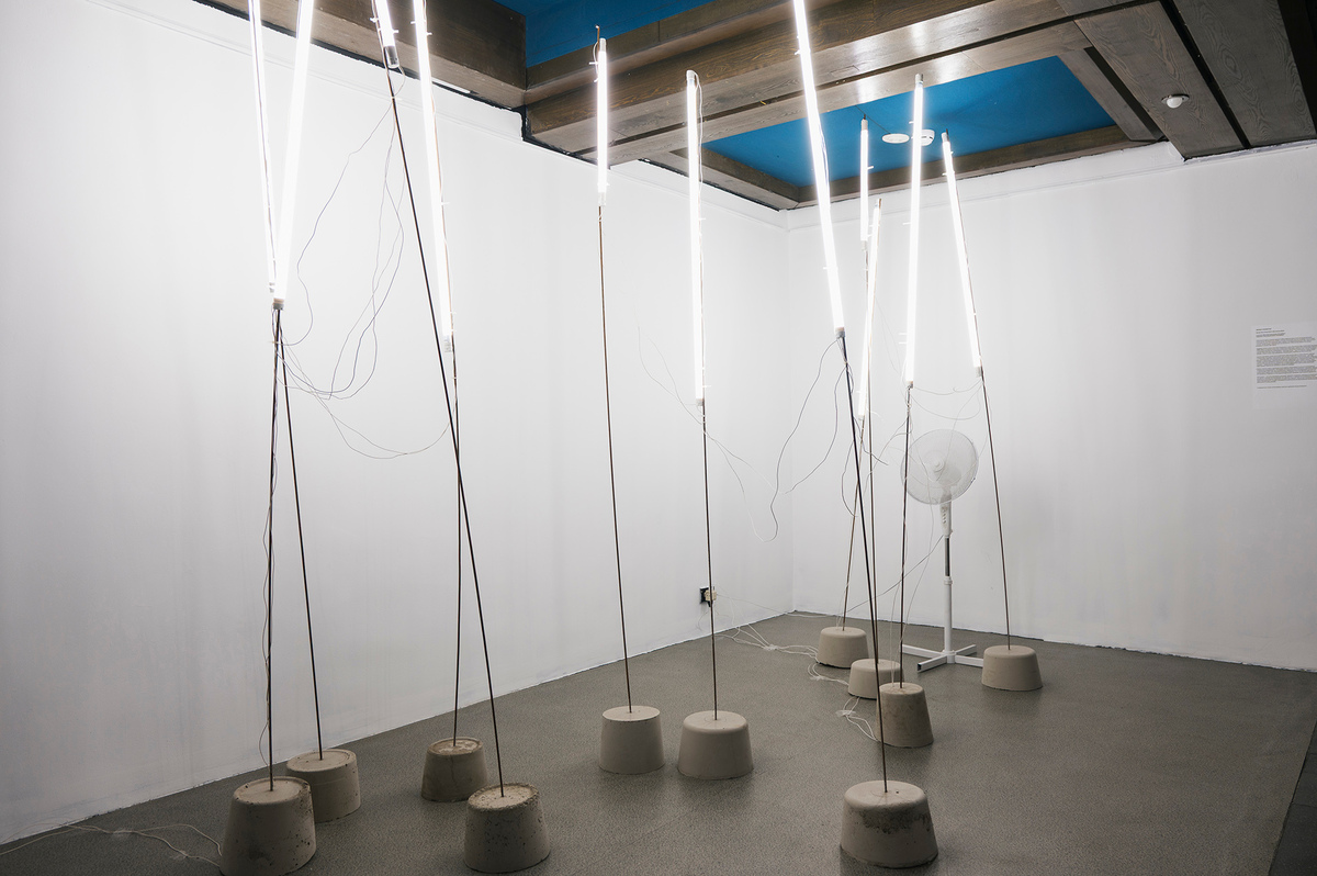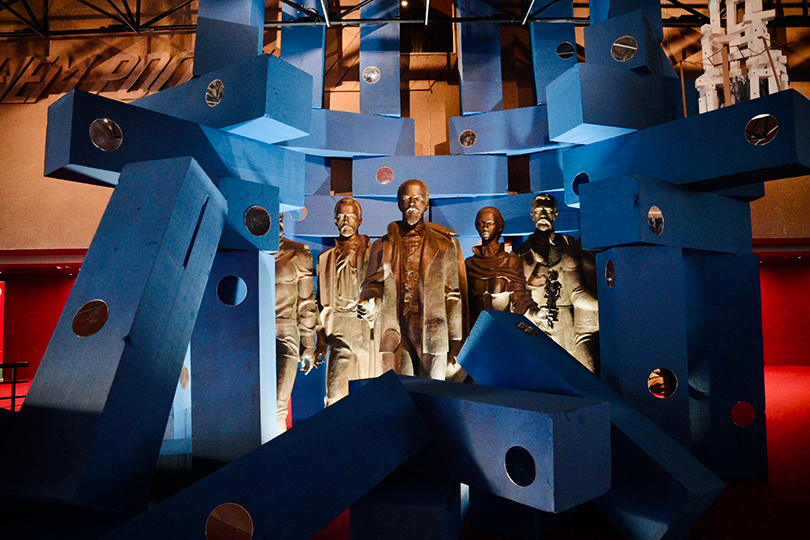 Эта многослойность встречает зрителя с порога — в аванзале Музейного центра выстроена большая скульптура, символ «биеннале надежды». Вертикальная композиция из 90 пенопластовых блоков отсылает и к архаической ярусной архитектуре, и к современным деконструктивистским формам. «Нижний ярус вбирает в себя “духов” музея Ленина, — заключает Александра, — бронзовую группу большевиков, которые кажутся одновременно атлантами и титанами».