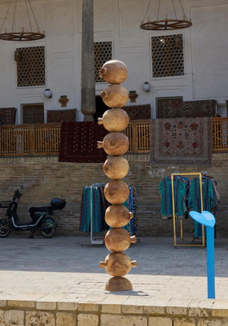 Локализация арт-рынка и смещение на Восток — такие два тренда отмечает в Бухаре куратор и директор галереи Serẽne (Москва/Лугано) Александр Бланарь. Каждый проект биеннале был сделан зарубежным художником совместно с узбекским коллегой. Например, местный художник Шоназар Джумаев построил с помощью бразильянки Эрики Верзутти «Башню из гранатов» — стоящие друг на друге деревянные плоды, чья выверенная геометрия и, конечно, материал напоминают о бухарской традиции резьбы по дереву. Проект Longing ткача Расулджона Мирзаахмедова (десять лет — с коллекции 2005 года — работавшего с Оскаром де ла Рентой) сделан вместе с индийской писательницей и перформером Химали Сингх Соин и музыкантом немецкого происхождения Дэвидом Соино Таппесером — это шелковое полотно, протянутое через арык (оросительный канал) Шахруд, некогда доставлявший в город питьевую воду. Впрочем, по мнению Бланаря, местные художники оказались не самыми популярными на выставке: «Все равно больше внимания привлекал сэр Энтони Гормли (британский скульптор-монументалист. — Прим. The Blueprint) и его проект Close, созданный вместе с реставратором Темуром Джумаевым». Лабиринт из каменных фигур человеческого (или в два раза больше) роста сочетался на выставке с food-медитацией Чон Кван — вдумчивого принятия пищи на камнях.
