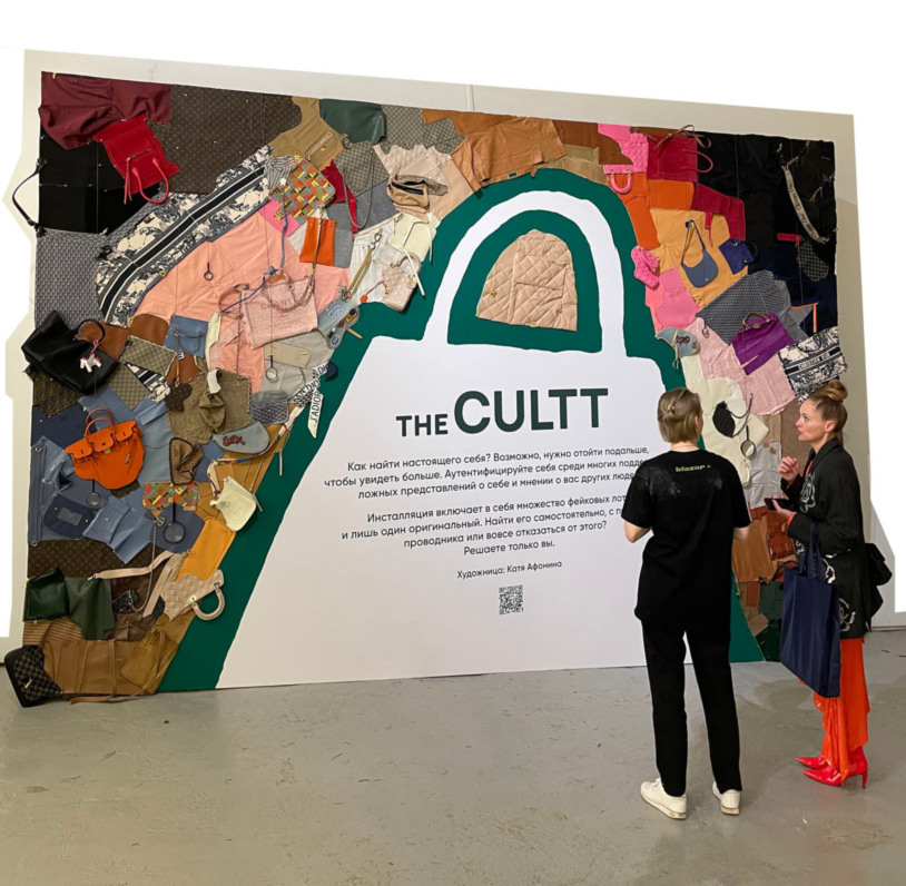 Какая ярмарка без тщеславия? Конечно, такое яркое событие светской жизни Москвы вызывает желание выгулять лучшие вещи и оценить чужие наряды. Однако активные обсуждения, где фейковая сумка, а где настоящая, происходили не среди галерейных рядов, а около инсталляции Кати Афониной для ресейл-платформы The Cultt. Среди множества нарезанных сумок нужно было найти одну оригинальную. Говорят, что пресс-волл изжил себя, но нет!