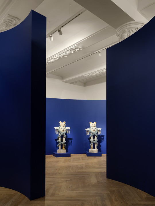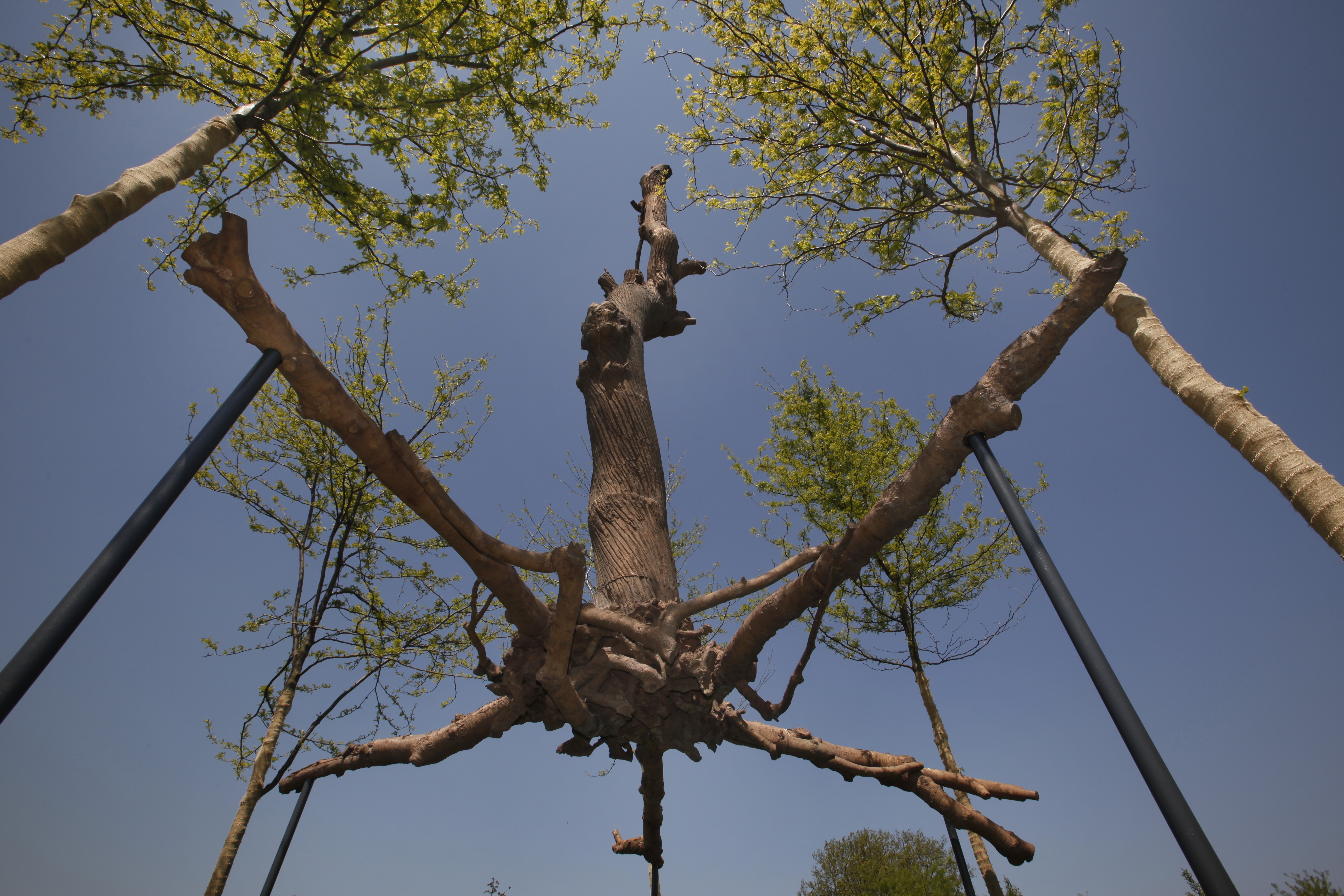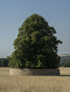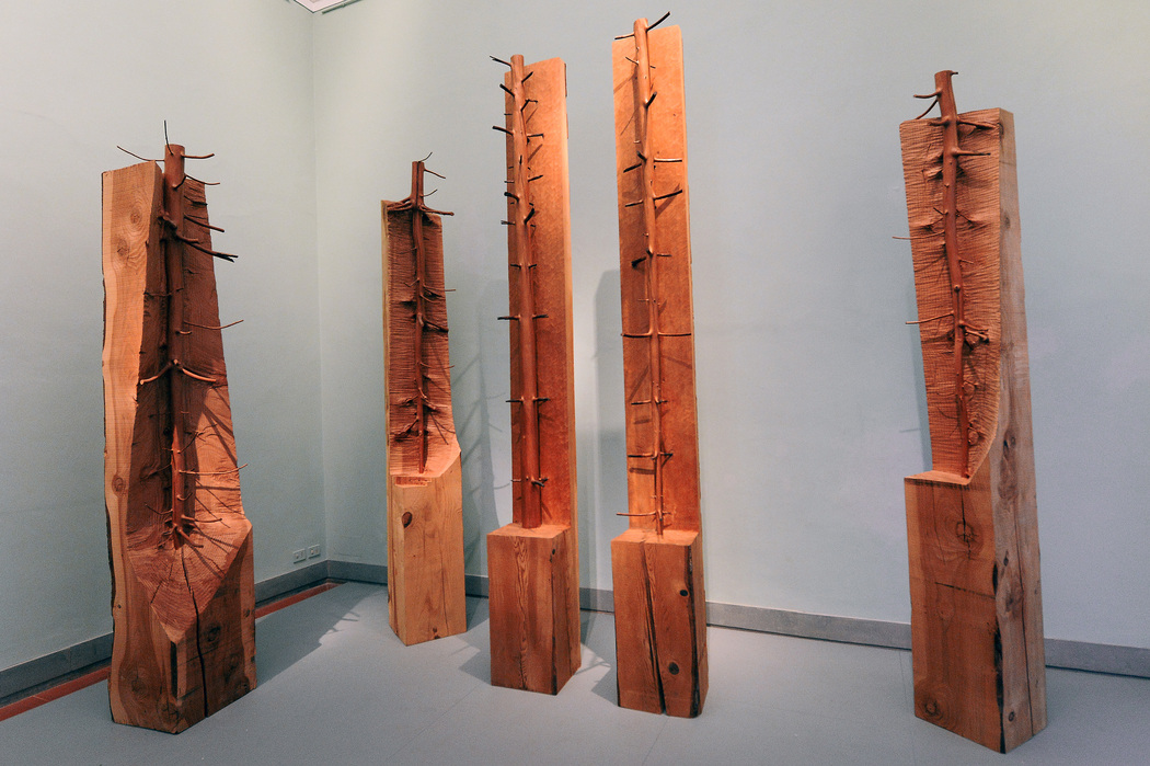 Peter’s Fold (2022) и прочие ландшафтные работы Энди Голсуорси подвержены постоянному влиянию природных стихий. Вал, возведенный вокруг старого дерева в Йоркширском парке скульптур в честь его экс-директора Питера Мюррея, возникает благодаря вмешательству художника, а затем распадается под действием времени, погоды, животных, посетителей парка. Работы Джузеппе Пеноне (серия Alberi) становятся и летописью роста дерева, и своего рода архивом возможностей: стульев, кораблей, полов, досок. "Мне кажется, что мир вокруг сейчас нестабилен, и для того, чтобы выплыть в этом бушующем океане, стоит схватиться за бревно. Именно поэтому я работаю с деревом. Конечно, я шучу, но для обретения опоры мне помогают несколько рецептов, и один из них — это осознание того, что законы природы гармоничны", — говорит Ульяна Подкорытова. Обращаясь к прошлому, художница находит в нем источник заземления, а помещая двух архаичных хранителей у порога выставки, приглашает зрителей в безопасное оберегаемое пространство.