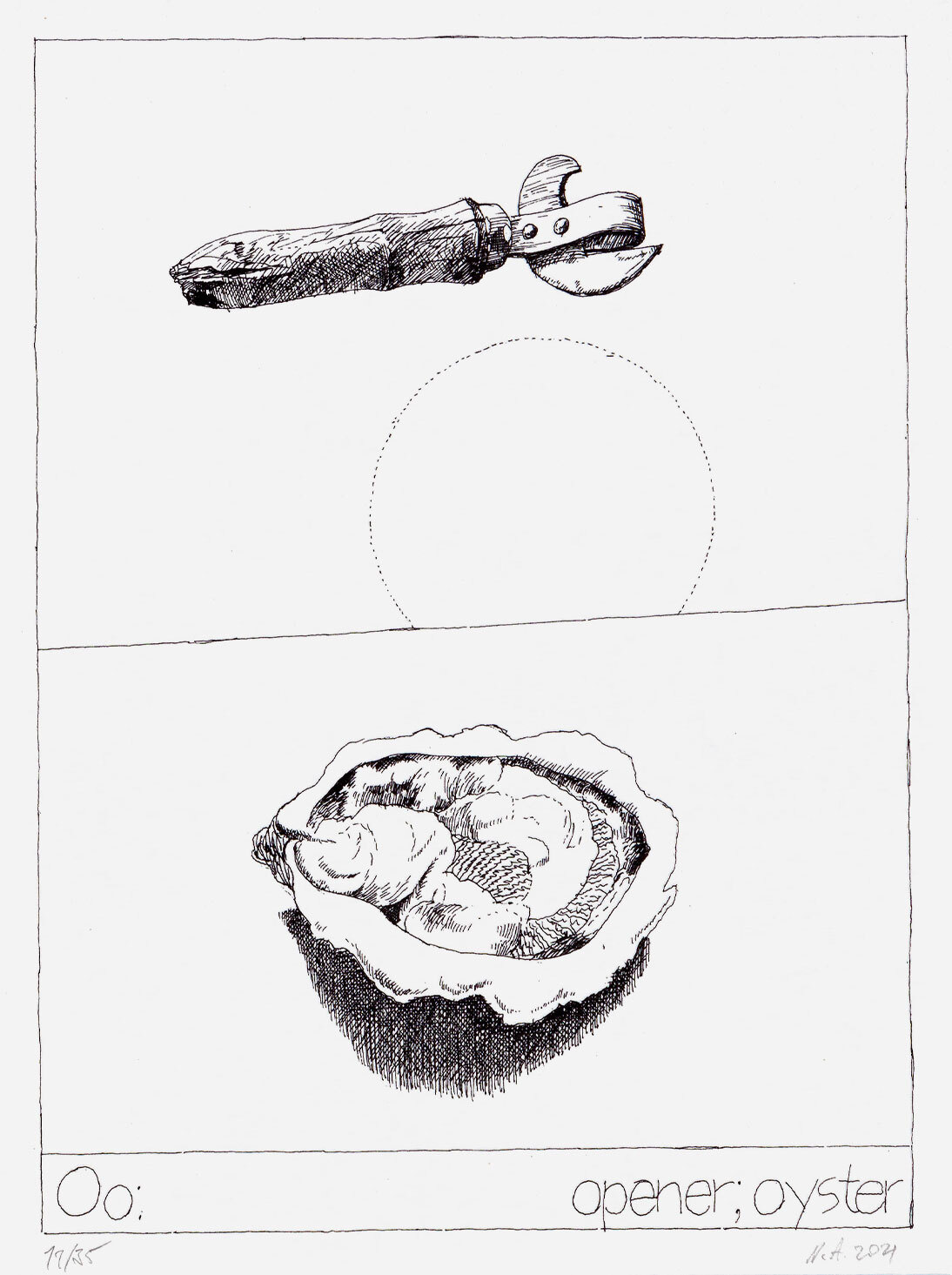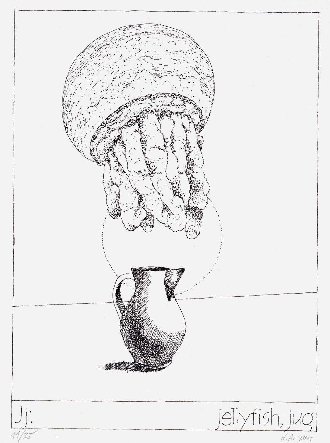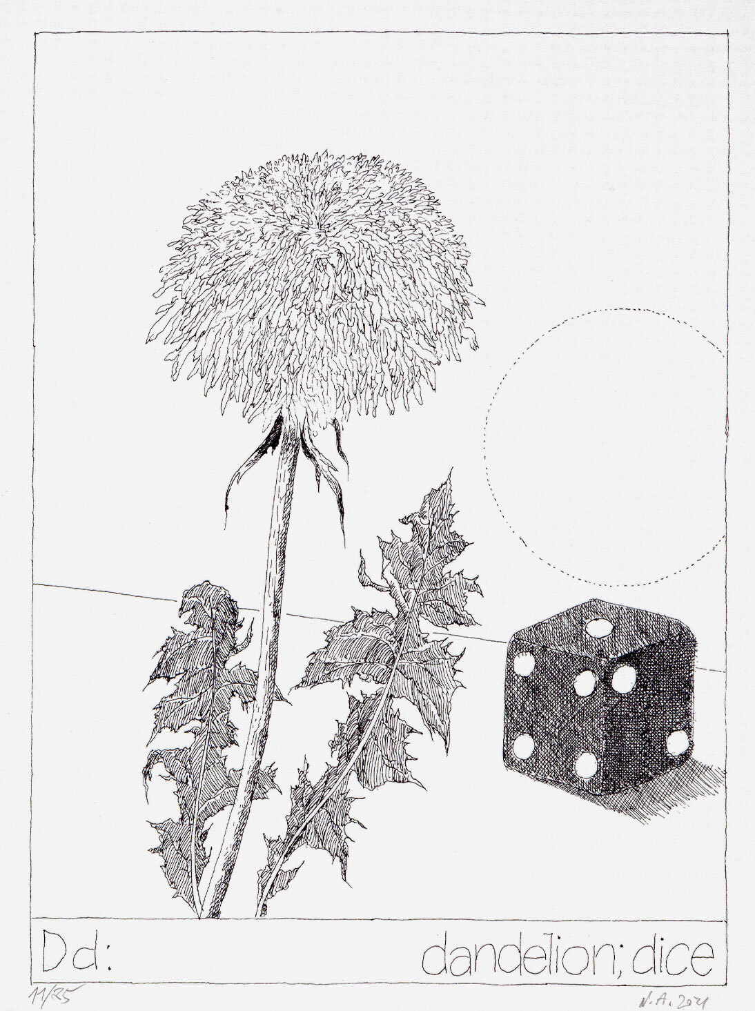 Перо, опускающееся на картошку фри. Медуза, вылетающая из графина. Игральный кубик на фоне пышного одуванчика. Альбом Your First Book участника группы «Коллективные действия» Никиты Алексеева (1953-2021) состоит из 27 таких графических листов. Выполненный в технике шелкографии, с авторской доработкой акварелью и карандашами, он существует в тираже всего 35 экземпляров (из них пять полностью раскрашены акварелью, а в оставшихся тридцати есть по три листа, раскрашенных карандашами).
