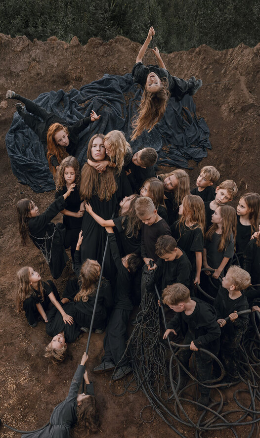 Проект «Художников года» по версии Cosmoscow 2025 — нижегородского дуэта Сергея Проворова и Галины Мызниковой. «Семена» — это триптих из фотографических полотен. Работа, отсылающая одновременно к классической скульптуре и современным практикам медиаискусства, должна стать «исследованием малоизученной формы перформативной скульптуры». Ее центральный образ — скульптура матери с детьми, напоминающая микеланджеловскую «Пьету». Все герои работы одеты в Ushatava — по словам основательницы бренда Нино Шаматавы, «этой весной я оказалась в Питере, и вдруг узнаю, что “ПРОВМЫЗА” готовят большую фотоработу. Я поняла, что хочу поддержать ее создание». Шаматава выступила спонсором проекта, чья идея родилась еще семь лет назад, — тогда, режиссируя на «Випперовских чтениях» в ГМИИ им. Пушкина перформанс Post-Mortem Chronography, «ПРОВМЫЗА» поставила во главу угла конфликт маленькой девочки и огромного здания: «Детский плач, казалось, заставлял содрогаться от эмоций огромное, несомасштабное телу ребенка здание». Девочка плакала, но в какой-то момент замолкала — ее голос умирал. Теперь молчание фотографии стало главным героем их нового проекта.