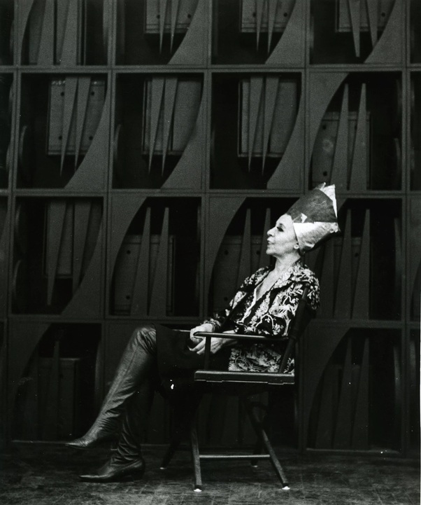 Портрет Луиз Невельсон на фоне картины «Ночной фокус — Рассвет», около 1969 года © Jeanne Bucher Jaeger, Paris–Lisbon