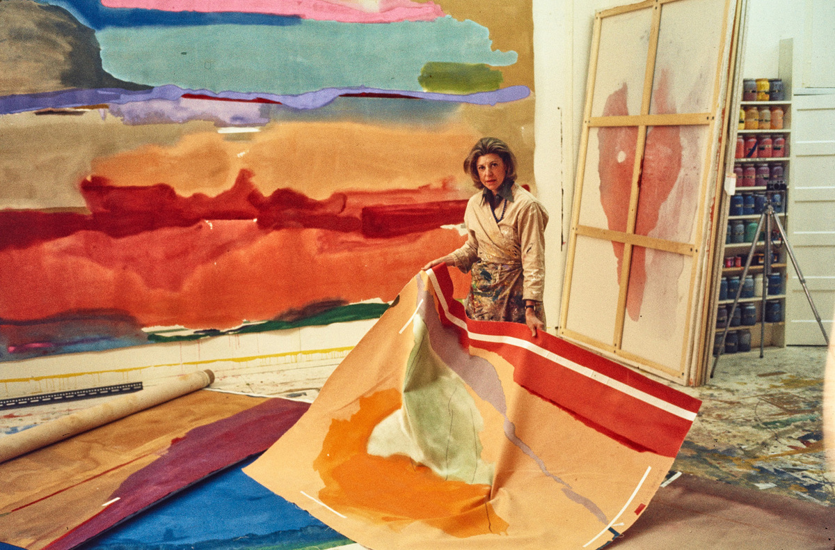 Ранняя работа Хелен Франкенталер (1928–2011) Mountains and Sea (1952) — точка отсчета ее карьеры. Загоревшись идеей передать ощущение от увиденного пейзажа, она выплеснула на негрунтованный холст разведенную скипидаром краску. Та мгновенно впиталась в ткань и стала полупрозрачной, будто акварель. Так Франкенталер нашла способ поместить изображение не на поверхность, а как бы внутрь холста. Изобретенный ею прием — soak-stain — позже станет основой того, что искусствоведы назовут «живописью цветового поля». В ее работах цвет распадается на текучие зоны, а композиция держится на напряжении между пятнами. Франкенталер балансирует между контролем и случайностью: краска растекается свободно, но пространство остается собранным и структурированным.