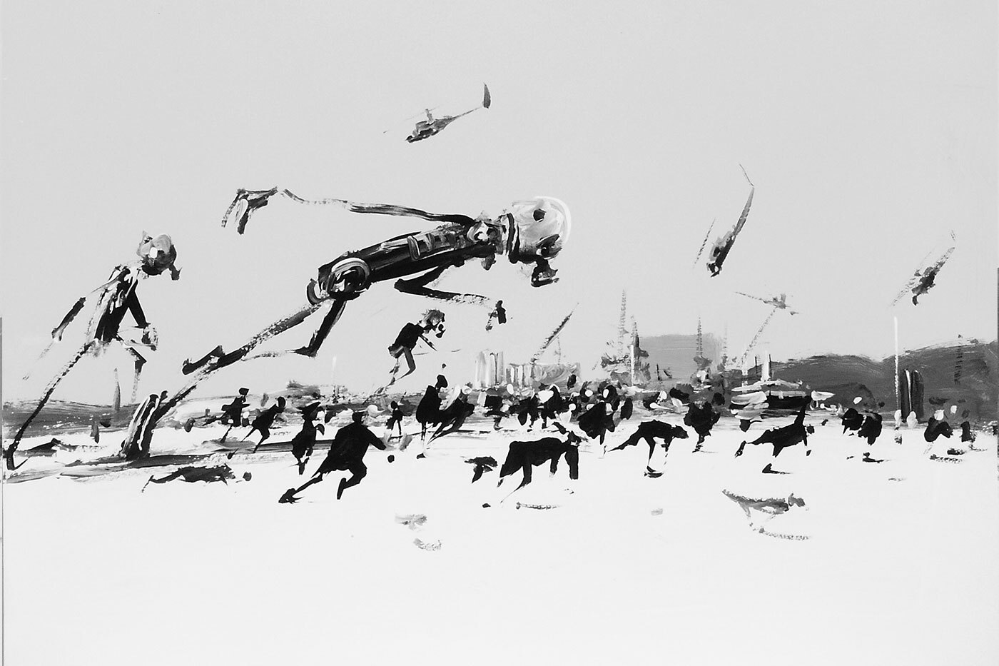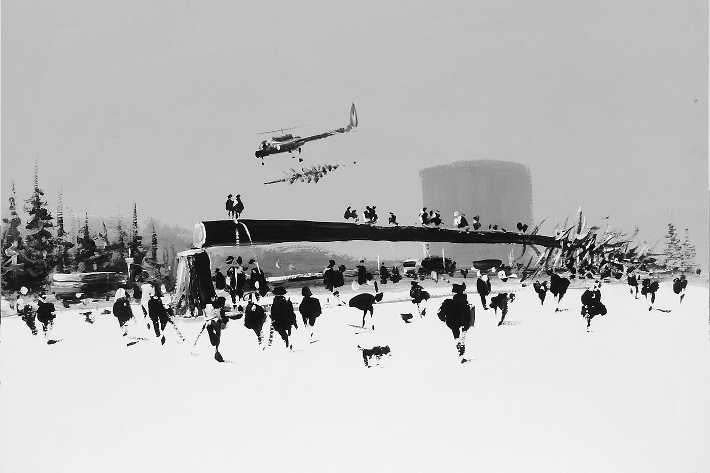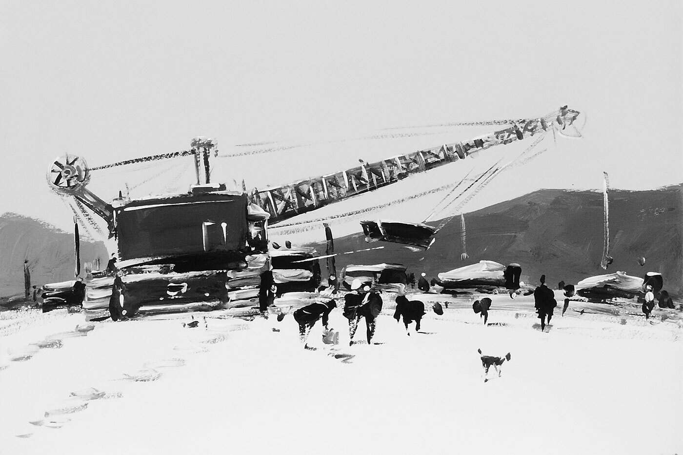 Работы Константина Батынкова, члена группы «Митьки», выставлялись в Третьяковке и МАММ, галереях Берлина и Вены. В 2004 году художник создал графическую серию «Другая жизнь» специально для Красноярского музейного центра. В 2026-м «Площадь мира» вновь представит эти работы о деревянных санках, аэропланах и дыме от костра, сквозь который проступает силуэт Годзиллы. По выражению арт-директора и куратора центра Сергея Ковалевского, «псевдоготическая культура Вечной Сибири» у Батынкова представляет потешные «войны миров» – что-то среднее между суриковским «Взятием снежного городка» и романом Герберта Уэллса. Знакомые объекты на переднем плане только подчеркивают хтоническую жуть — великанов, вырисовывающихся вдали.