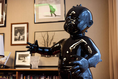 Потом я начинала смотреть сериал «Сто лет одиночества». Мне все говорили — не смотри сериал, понятно, что это не книга… Но так как смотреть в нашей стране особенно нечего, я думаю — ладно. Просто я очень люблю книгу. И я понимаю, что вот эти «Ангелы и Демоны» [Angels-Demons, AES+F] меня связывают с этим сериалом — главная героиня все переживала, что она родит с хвостом кого-то… а в самом конце говорит: «Я всегда боялась, что я рожу кого-то, и в общем я его и родила». Я поняла, что мне очень нравится эта тема, звоню Ханкину, и он говорит: «Господи, как тебя шибануло!». И я покупаю у него эту скульптуру.
