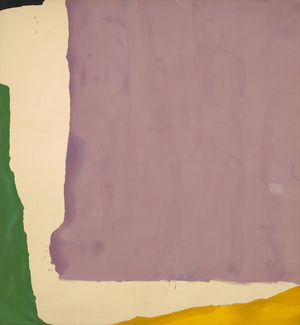 В 1960-е она постепенно отходит от экспрессивных пятен и переходит к большим поверхностям цвета. Меняет масло на акрил — материал, который подчеркивает край, угол, форму. Ее композиции становятся смелее, холст — более открытым. Полотно The Bay (1963) показывает этот переход лучше всего: цвет течет, но не распадается; картина одновременно спокойная и напряженная. Ротко в это же время делал окна в эмоции, Франкенталер создает границы состояний: моменты, когда цвет еще не стал формой, но уже перестал быть пятном. В это же время в американский мейнстрим входит минимализм, меняется язык формы, и Франкенталер реагирует на это (не подражает, но слышит). Ее интерес сдвигается к структуре. Mauve District (1966, тоже есть на выставке) — прекрасный пример ее внимания к пустоте как к самостоятельному элементу. District — это территория, зона, участок, а mauve — серо-лиловый, приглушенный, переходный цвет, не претендующий на доминирование, но меняющий все вокруг. Франкенталер сознательно уходит от яркой экспрессии. Цвет работы балансирует между присутствием и исчезновением — что важно для художницы, которая показывает, что переходное состояние само по себе может стать формой художественного высказывания.
