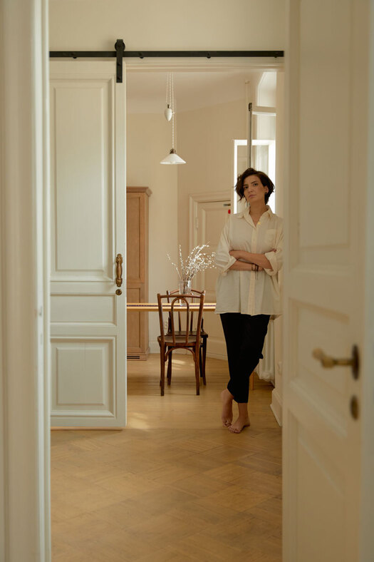 Переехав в Петербург, я поселилась на Петроградской стороне и, конечно, стала фанатом Петроградки... Я живу в Доме Бенуа, где Шостакович писал Ленинградскую симфонию и где жили Надежда Добычина, Киров и многие другие. Первый год моя дочка Кира считала, что Музей Кирова назван в честь нее. Мой питерский дом — это полупустая большая квартира, куда я перевезла совсем мало вещей, мне хотелось сохранить в ней воздух и пространство. Но потихоньку она тоже наполняется книгами и искусством. Ее владельцы очень трепетно восстанавливали все исторические детали, собирались делать в ней резиденцию для скандинавских художников, но случился ковид. Теперь у меня есть гостевой альбом, а ключи от квартиры ходят по московским друзьям-коллегам — в доме всегда живут гости. Мне важно было в трудные времена наполнить дом жизнью.
