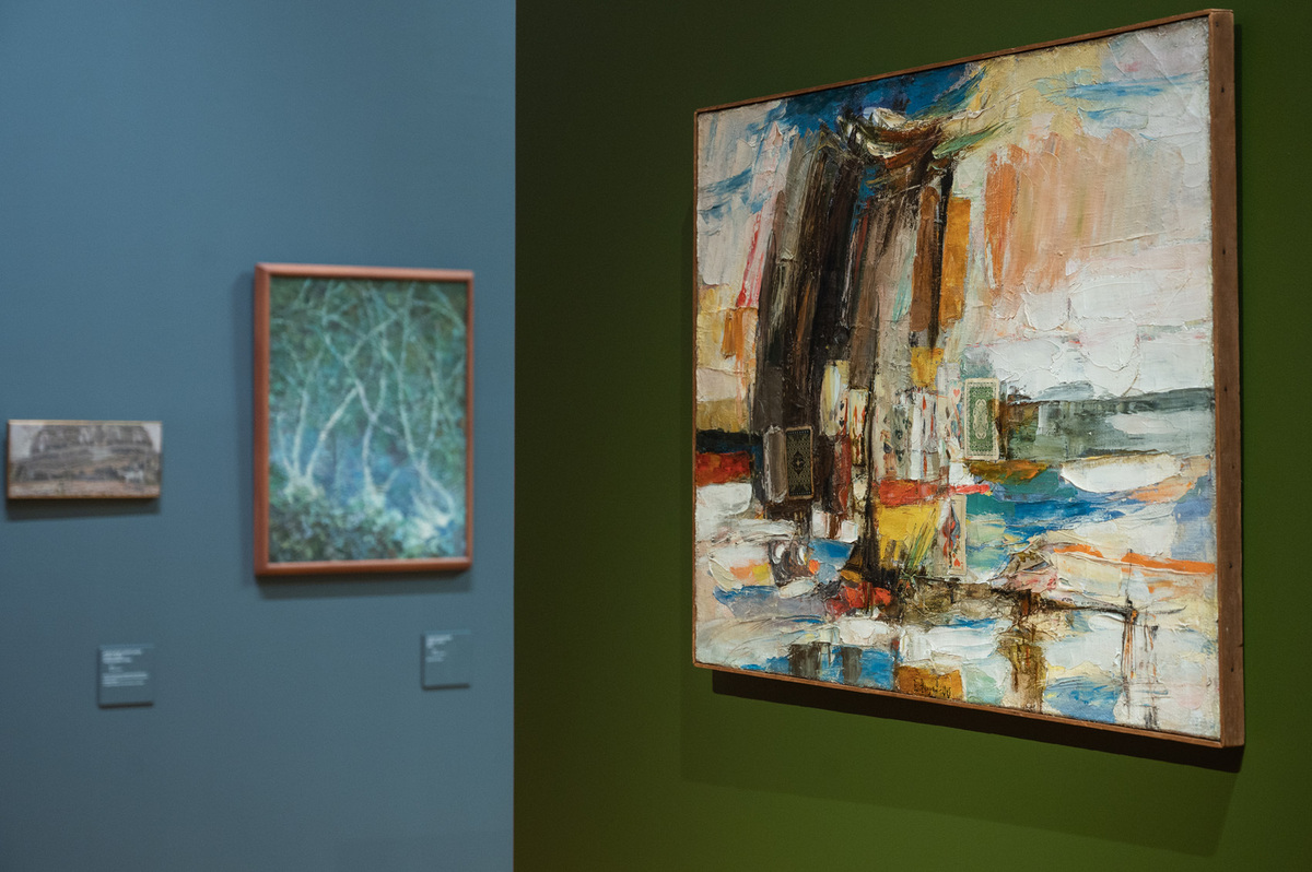 Вот они все рядом — на фотографиях. Немухина видно сразу: шарж кажется даже излишним, ведь сам облик его будто бы гипертрофированно художнический. Берет, усы, богемный (насколько позволял репертуар советской моды) шик — все на грани точного совпадения с расхожим типажом «художник» и веселой ухмылкой тщательно продуманного облика. Фотографии запечатлели Немухина в кругу друзей, в историю они войдут как «Лианозовская школа». Негласно передавая привет вездесущей Биеннале частных коллекций, кураторы выставки Немухина посвятили один из разделов экспозиции собранию самого художника — его он передал Третьяковской галерее. Это работы его друзей и визави, тех, в общении, согласии и полемике с которыми он формировал собственный язык. Тут и Лев Кропивницкий, и Николай Вечтомов, и нетипичный натюрморт Олега Целкова, и Лидия Мастеркова, и многие другие. Это не «диалогическая» выборка, никаких формальных или концептуальных рифм работ Немухина с произведениями его коллекции нет, однако нам представили контекст близкого круга: вновь напоминая о жанре, камерная выставка.
